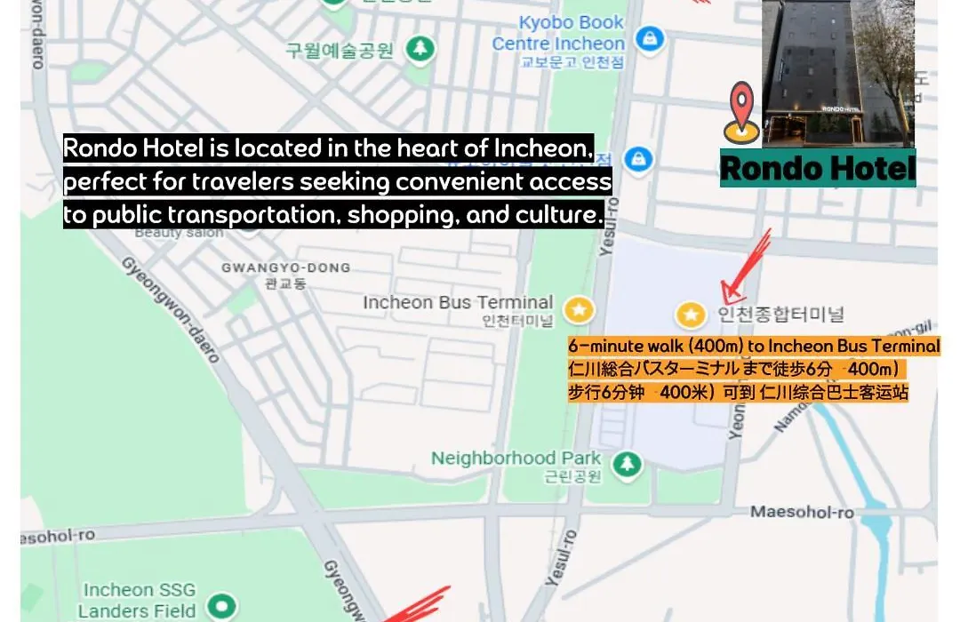 Guwol Rondo Hotel インチョン広域市はニューコアアウトレット 仁川店から徒歩でわずか5分で、ギル病院からわずか1.1キロメートルの場所にあります。